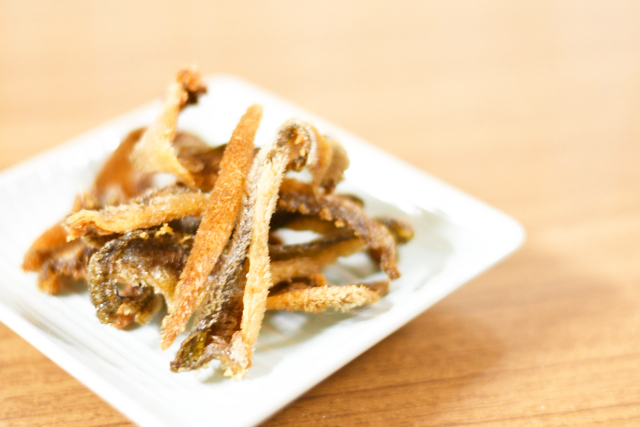 などなど。こちらはアラ炊きやアラ焼きとは打って変わって、骨が柔らかめの魚体の小さい、後は長物系の魚の骨が使われることが多いです。逆にタイなどの骨が固い魚種はあまり向かない種類ですね。パリッと揚がった、もしくは焼かれた骨は食感もパリパリで文字通りせんべい感覚で味わい楽しむことができ、お箸が止まらなくなること請け合いでございます。